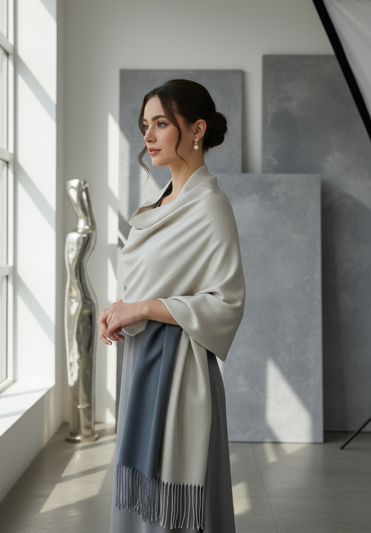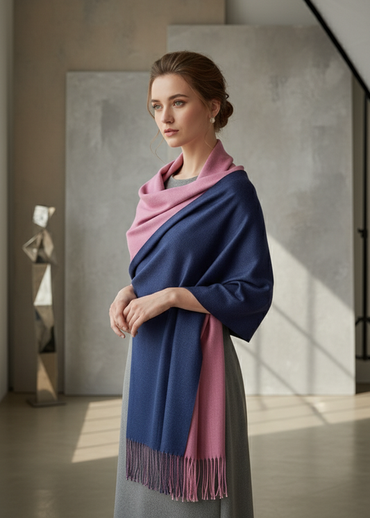 A two-tone shawl in Zohras Clothing features a luxurious blend of soft cashmere in two harmonious colors. The shawl showcases a gradient or contrasting color scheme, often with one hue as the primary shade and a complementary or contrasting secondary shade.
